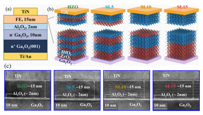 FIG. 2. (a) Schematic of the β-Ga2O3 MFIS capacitor structure. (b) Schematic illustrating the preparation of SL and HZO with different HfO2/ZrO2 ratios. (c) Crosssectional HRTEM images of annealed HZO, SL5, SL10, and SL15 films.