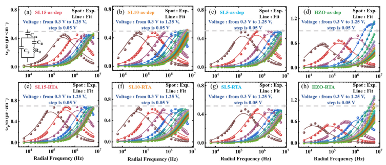 FIG. 5. Frequency-dependent conductance plots of TiN/FE/Al2O3/β-Ga2O3 MFIS capacitors for (a) SL15, (b) SL10, (c) SL5, and (d) HZO as-fabricated, and (e) SL15, (f) SL10, (g) SL5, and (h) HZO after 550 °C annealing.