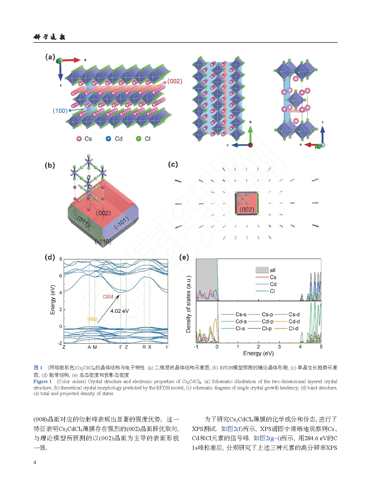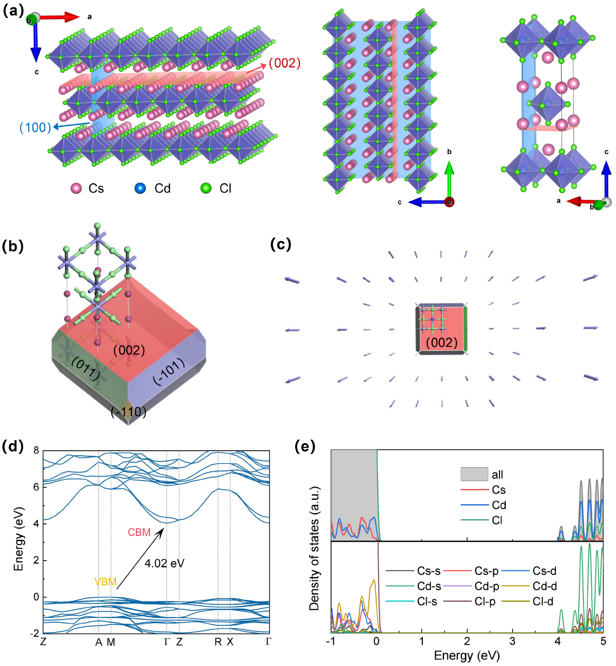 Figure 1. Crystal structure and electronic properties of Cs2CdCl4. (a) Schematic illustration of the two-dimensional layered crystal structure; (b) theoretical crystal morphology predicted by the BFDH model; (c) schematic diagram of single crystal growth tendency; (d) band structure; (e) total and projected density of states