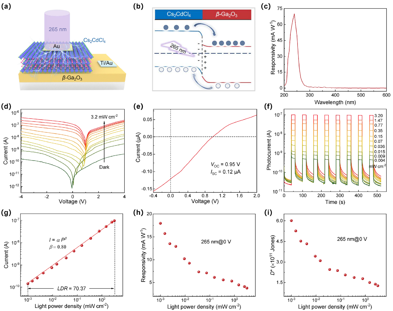 Figure 4. Solar-blind ultraviolet photodetection performance of Cs2CdCl4/β-Ga2O3 heterojunction photodetectors. (a) Schematic diagram of the device structure; (b) schematic illustration of the band alignment in the Cs2CdCl4/β-Ga2O3 heterojunction under solar-blind UV illumination; (c) responsivity spectrum of the device at 0 V; (d) current-voltage (I–V) characteristics of the device under dark conditions and different incident light power densities; (e) zoomed-in I−V curves highlighting the photovoltaic effect in the Cs2CdCl4/β-Ga2O3 heterojunction; (f) photocurrent versus time (I−t) curves of the device under different light power densities; variation of (g) photocurrent, (h) responsivity (R), and (i) specific detectivity (D*) of the device with incident light power density at 0 V bias