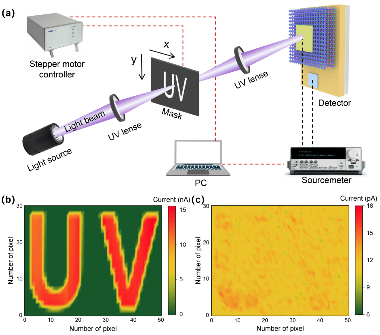 Figure 5. Solar-blind UV imaging system based on a Cs2CdCl4/β-Ga2O3 heterojunction photodetector. (a) Schematic diagram of the image sensing setup; Imaging results of “UV” patterns obtained under (b) 265 nm and (c) 360 nm illumination conditions