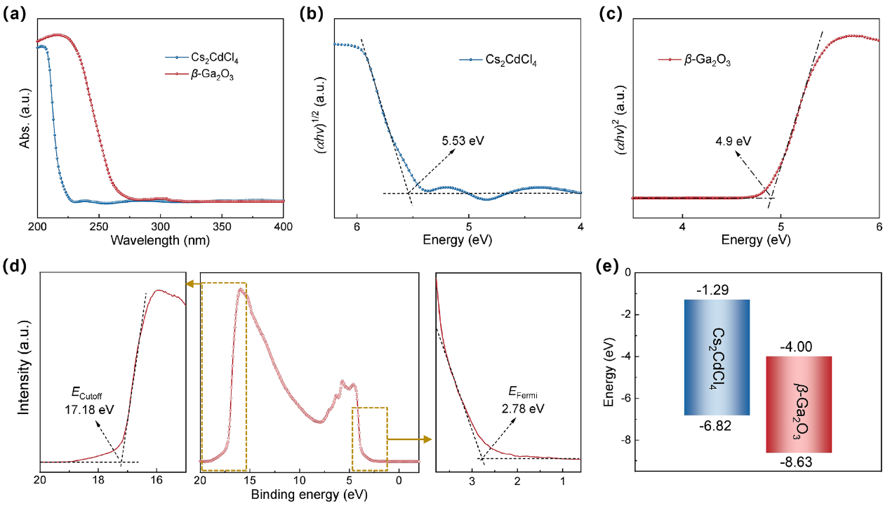 Figure 3. Optical properties and band structure analysis of Cs2CdCl4 and β-Ga2O3. (a) Absorption spectra of Cs2CdCl4 thin films and β-Ga2O3; (b) Tauc plot of Cs2CdCl4 thin films; (c) Tauc plot of β-Ga2O3; (d) UPS data of Cs2CdCl4 thin films; (e) schematic band alignment diagram of the Cs2CdCl4/β-Ga2O3 heterojunction