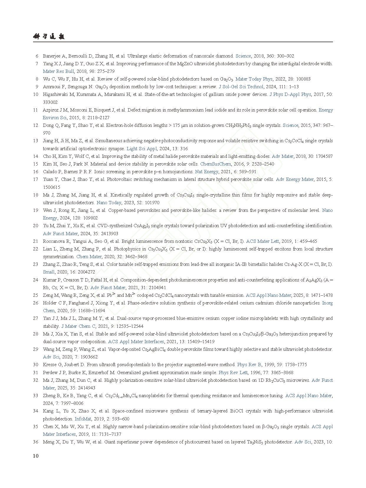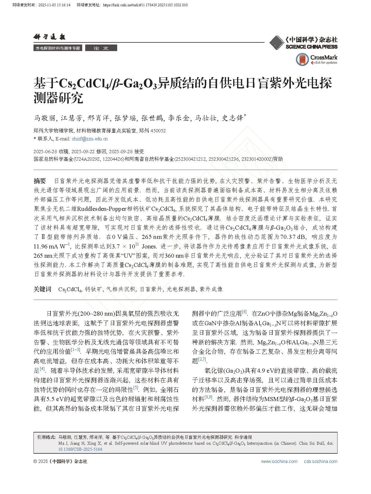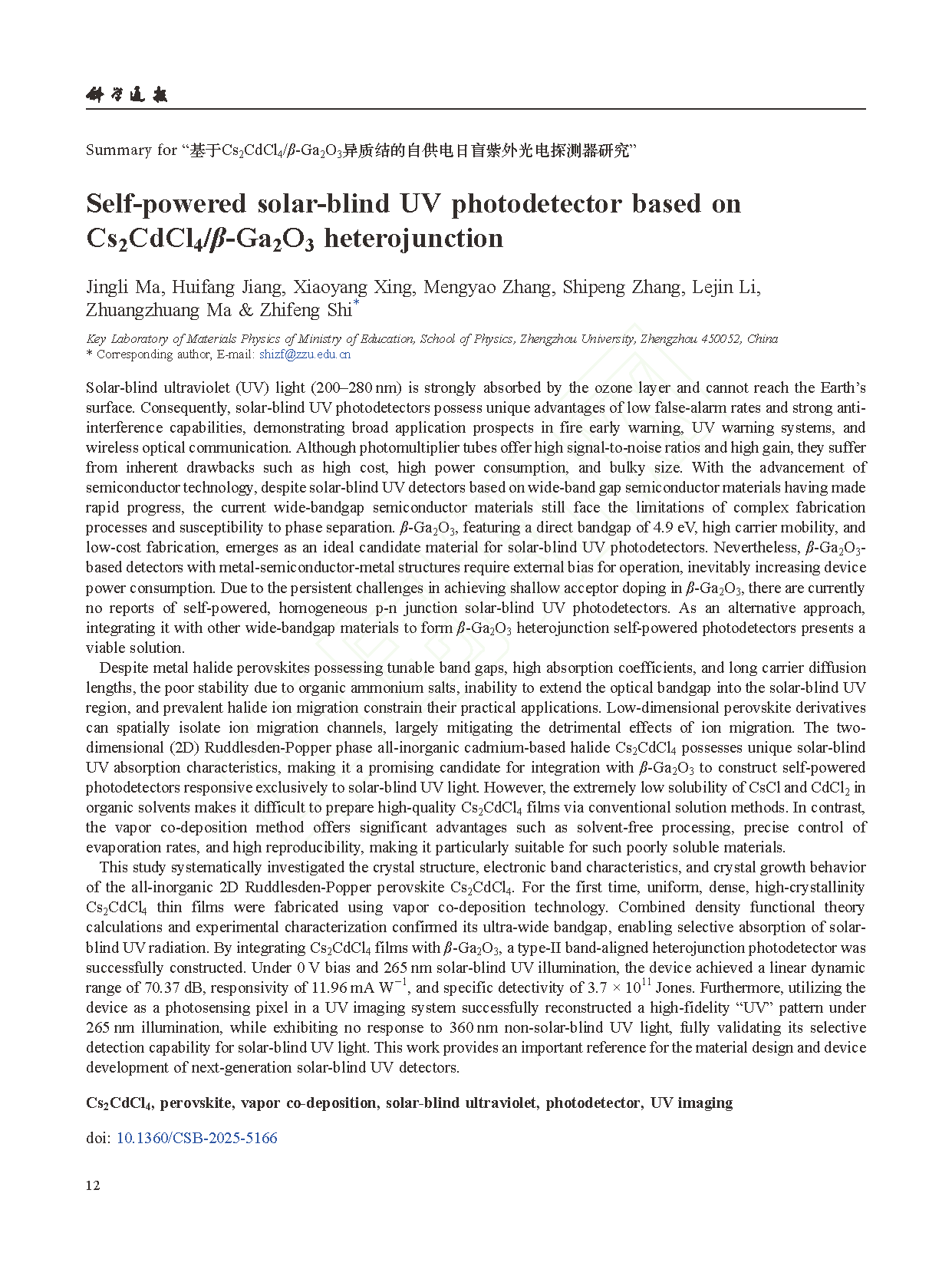 Researchers from the Zhengzhou University have published a dissertation titled "Self-powered solar-blind UV photodetector based on Cs2CdCl4/β-Ga2O3 heterojunction in Chinese Science Bulletin.