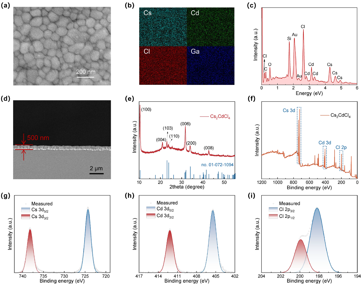 Figure 2. Morphological, structural, and compositional characterization of the Cs2CdCl4 thin films. (a) Top-view SEM image; (b) elemental mapping; (c) EDS spectrum; (d) cross-sectional SEM image; (e) XRD pattern compared with the standard reference for tetragonal Cs2CdCl4; (f) XPS survey spectrum; high resolution XPS spectra of (g) Cs 3d, (h) Cd 3d, and (i) Cl 2p