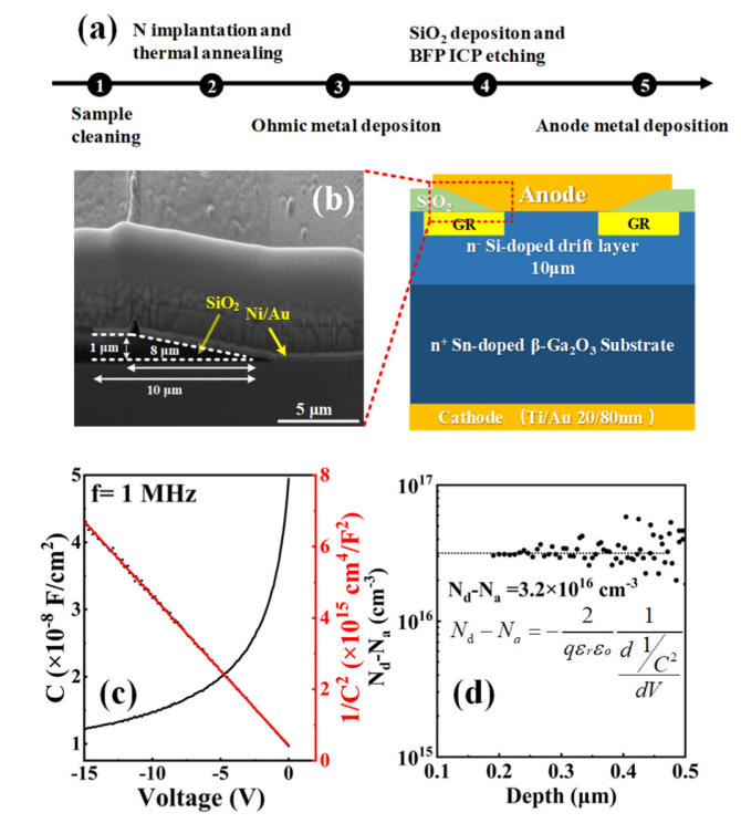 FIG. 6. (a) Main fabrication steps of β-Ga2O3 GR/BFP-SBDs. (b) Cross-sectional SEM images of GR/BFP-SBDs. (c) C–V characteristics of GR/BFP-SBDs. (d) Extracted carrier concentration of GR/BFP-SBDs.