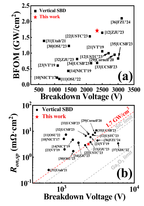 FIG. 10. Benchmark of (a) BFOM vs Vbr and (b) Ron,sp vs Vbr of the reported vertical β-Ga2O3 SBDs.