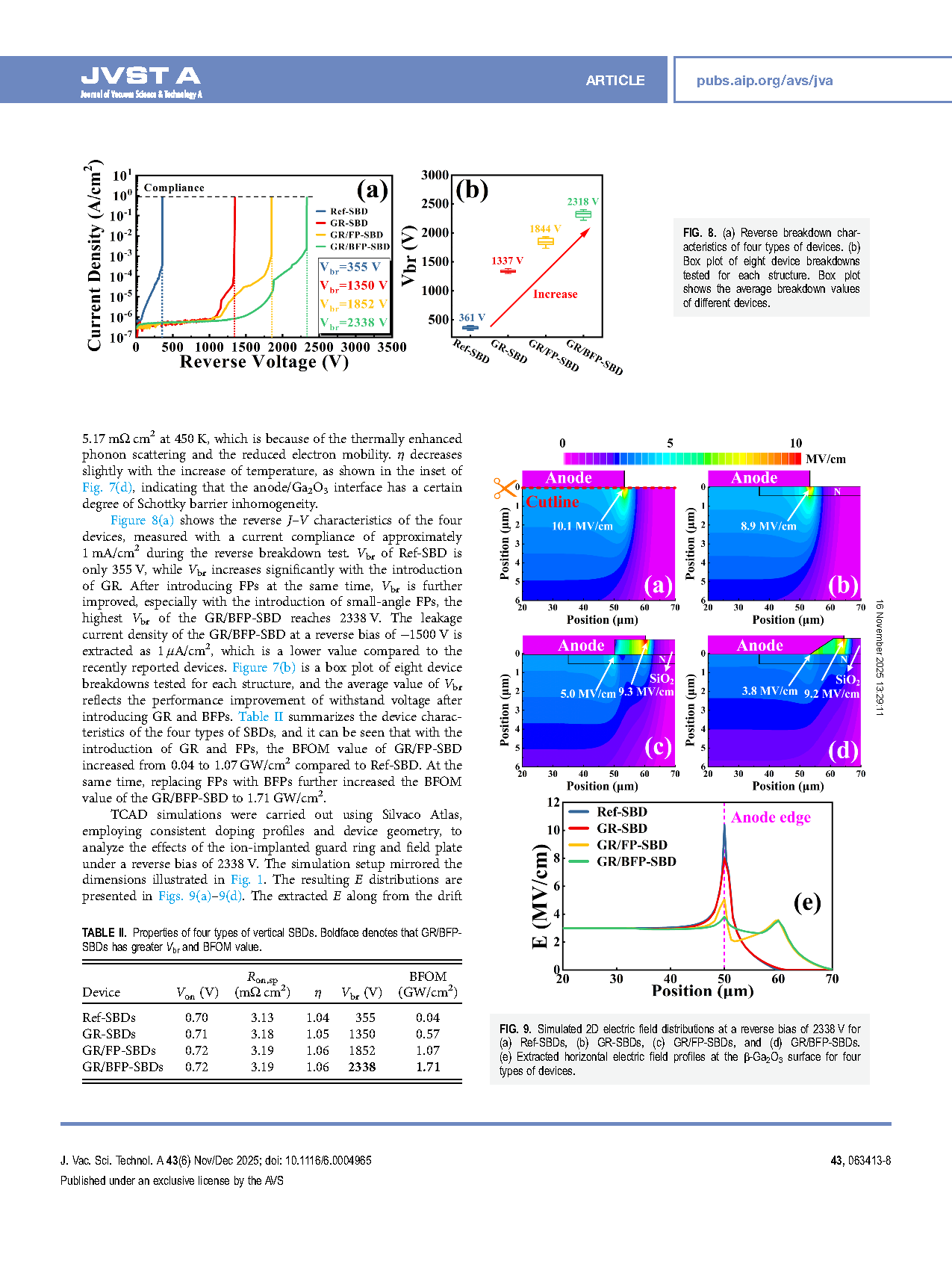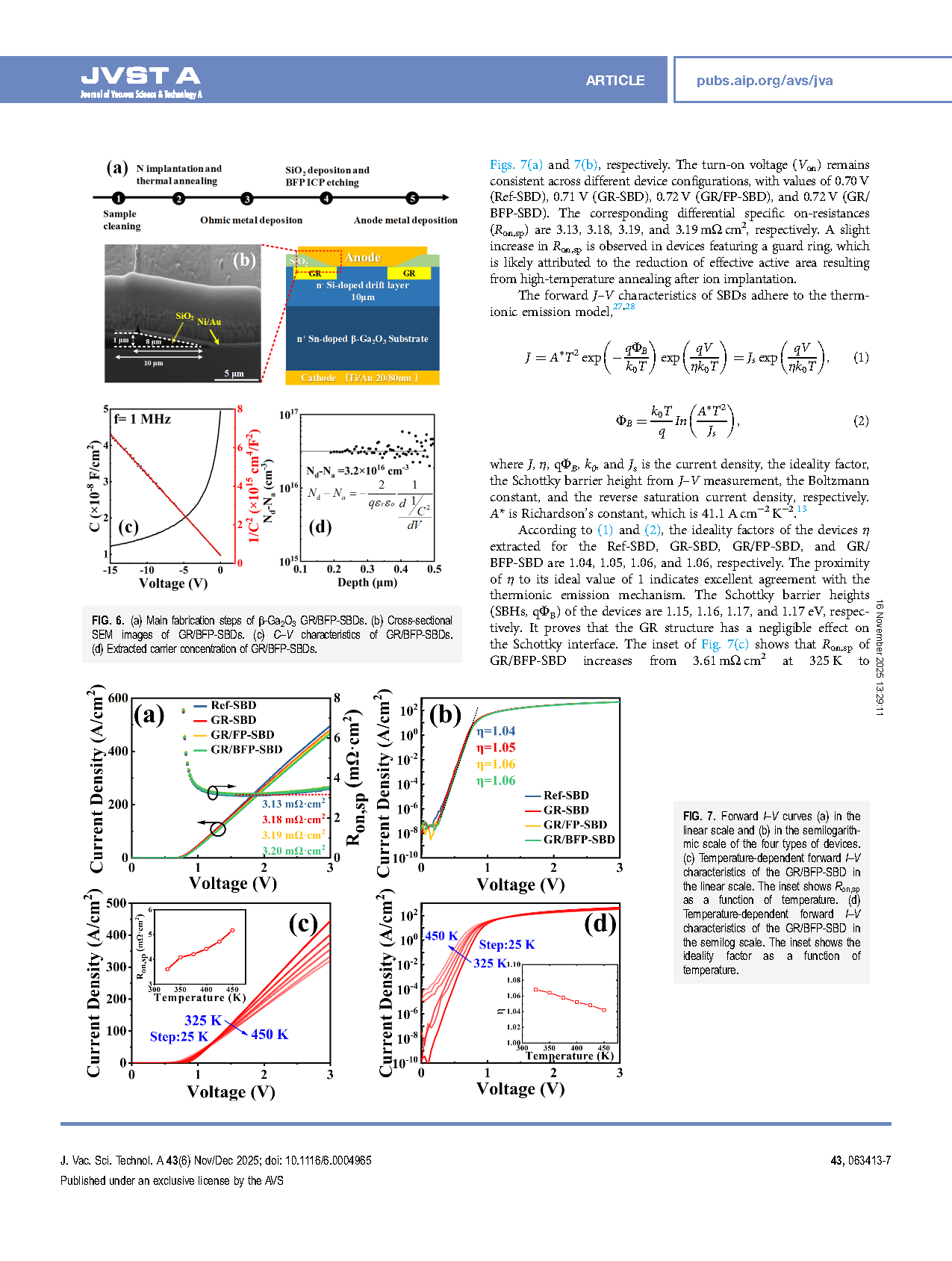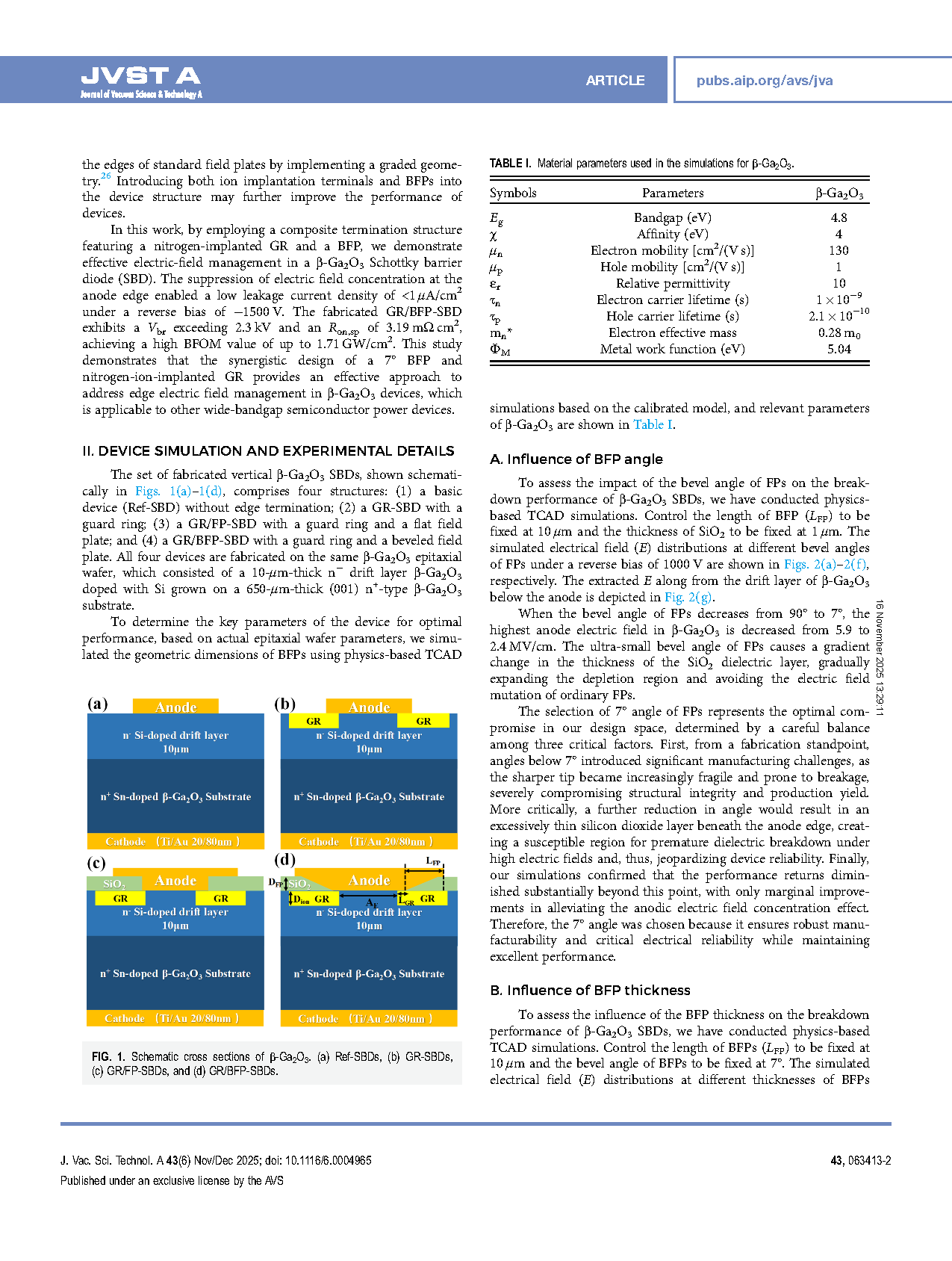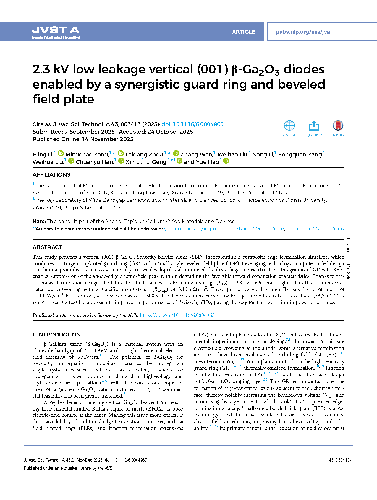 Researchers from the Xidian University and Xi’an Jiaotong University have published a dissertation titled "2.3 kV low leakage vertical (001) β-Ga2O3 diodes enabled by a synergistic guard ring and beveled field plate " in Journal of Vacuum Science & Technology A