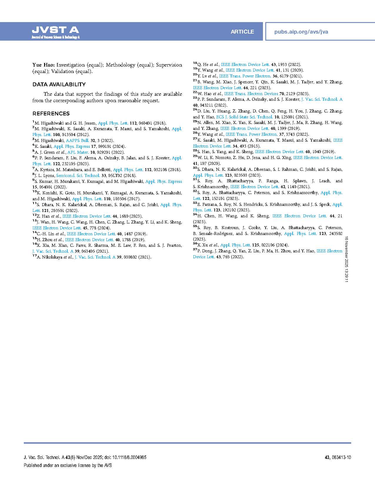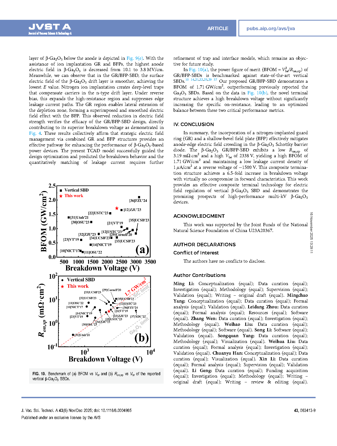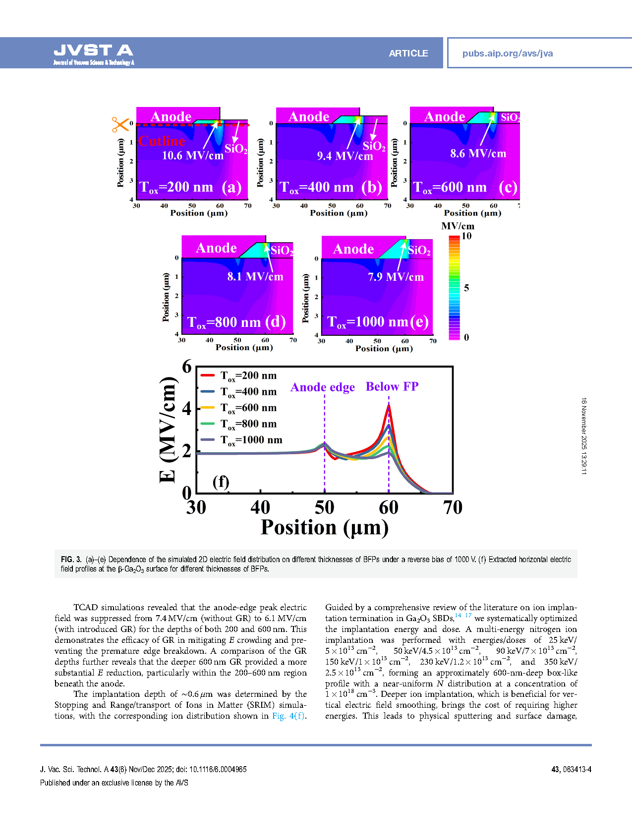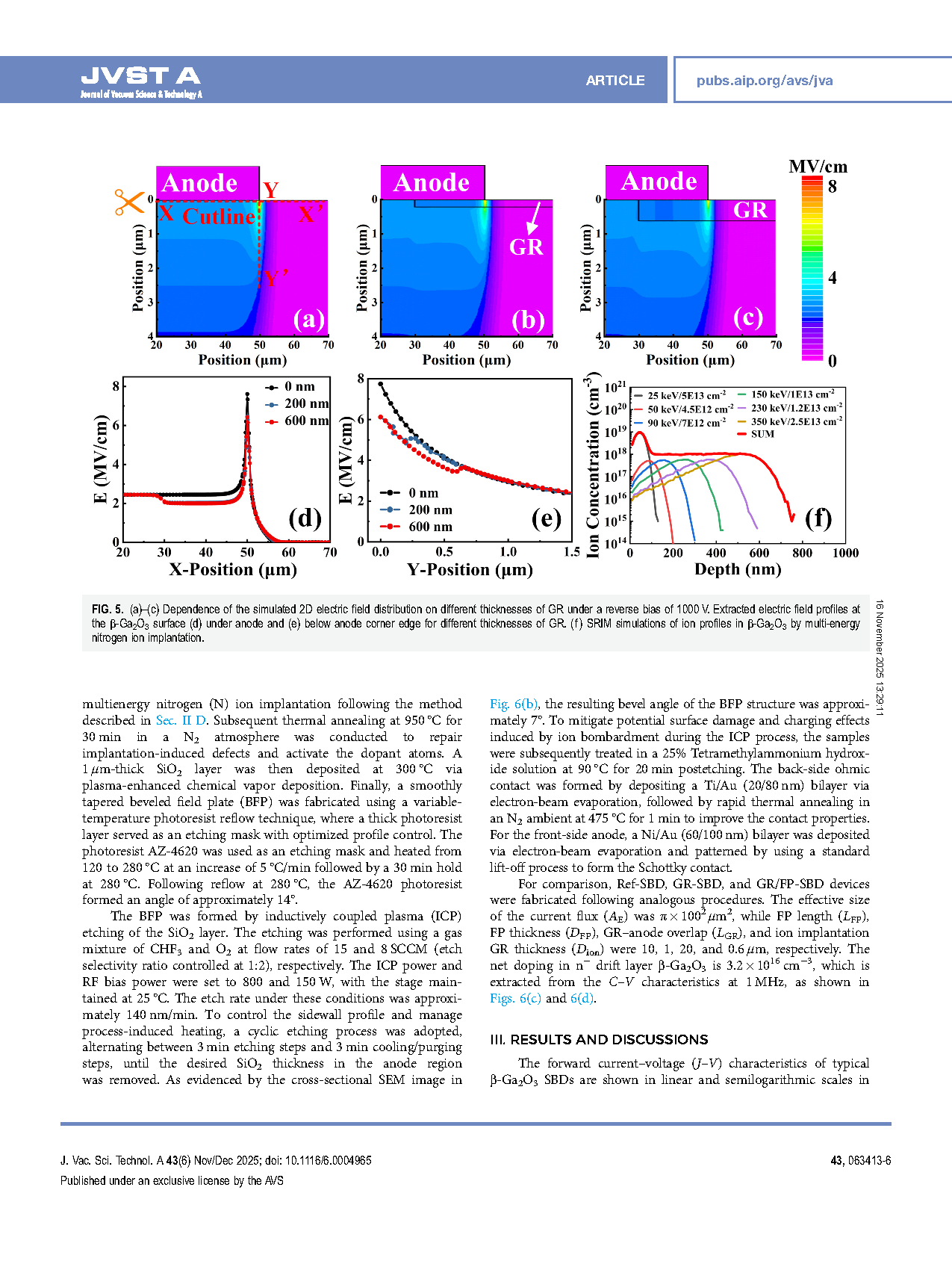 Researchers from the Xidian University and Xi’an Jiaotong University have published a dissertation titled "2.3 kV low leakage vertical (001) β-Ga2O3 diodes enabled by a synergistic guard ring and beveled field plate " in Journal of Vacuum Science & Technology A