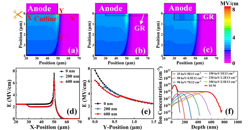 In summary, the incorporation of a nitrogen-implanted guard ring (GR) and a shallow-bevel field plate (BFP) effectively mitigates anode-edge electric field crowding in the β-Ga2O3 Schottky barrier diode. The β-Ga2O3 GR/BFP-SBD exhibits a low Ron,sp of 3.19 mΩ cm2 and a high Vbr of 2338 V, yielding a high BFOM of 1.71 GW/cm2 and maintaining a low leakage current density of 1 μA/cm2 at a reverse voltage of −1500 V. This composite termination structure achieves a 6.5-fold increase in breakdown voltage with virtually no compromise in forward characteristics. This work provides an effective composite terminal technology for electric field regulation of vertical β-Ga2O3 SBD and demonstrates the promising prospects of high-performance multi-kV β-Ga2O3 devices.