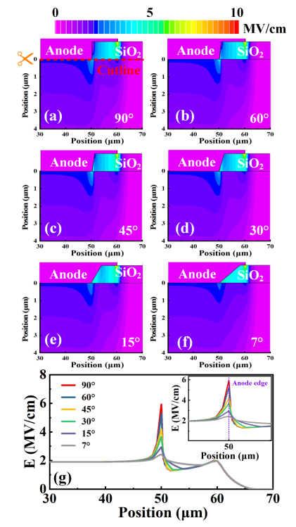 FIG. 2. (a)–(f) Dependence of the simulated 2D electric field distribution on different bevel angles of FPs under a reverse bias of 1000 V. (g) Extracted horizontal electric field profiles at the β-Ga2O3 surface for FPs with different bevel angles.
