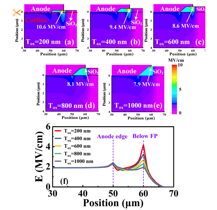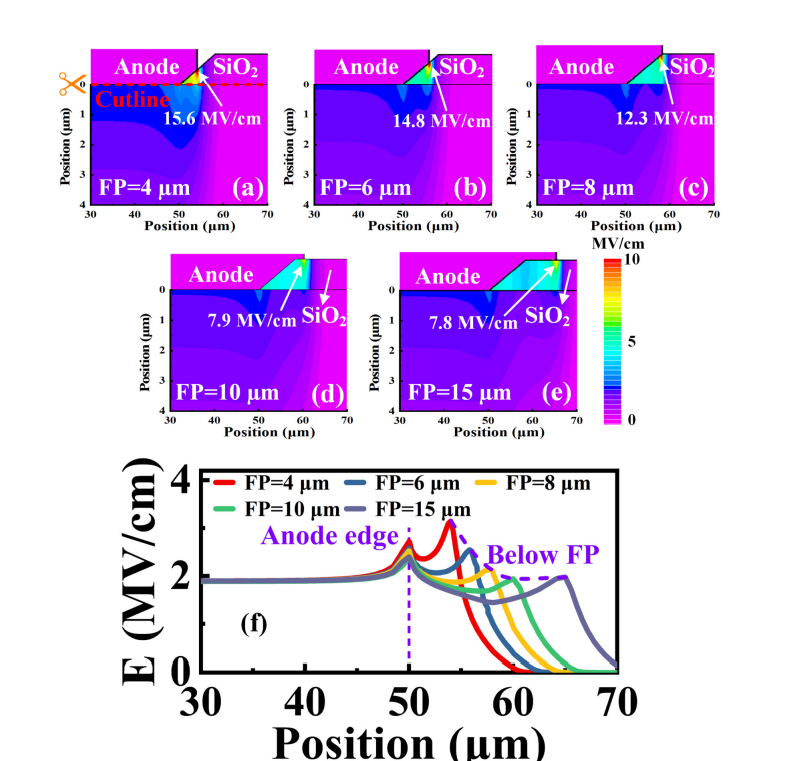FIG. 3. (a)–(e) Dependence of the simulated 2D electric field distribution on different thicknesses of BFPs under a reverse bias of 1000 V. (f) Extracted horizontal electric field profiles at the β-Ga2O3 surface for different thicknesses of BFPs.