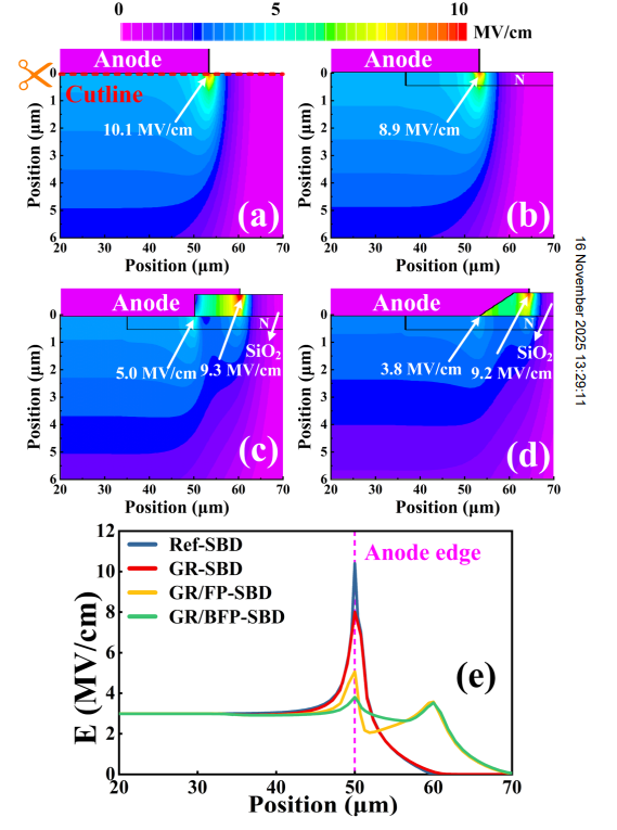 FIG. 9. Simulated 2D electric field distributions at a reverse bias of 2338 V for (a) Ref-SBDs, (b) GR-SBDs, (c) GR/FP-SBDs, and (d) GR/BFP-SBDs. (e) Extracted horizontal electric field profiles at the β-Ga2O3 surface for four types of devices.