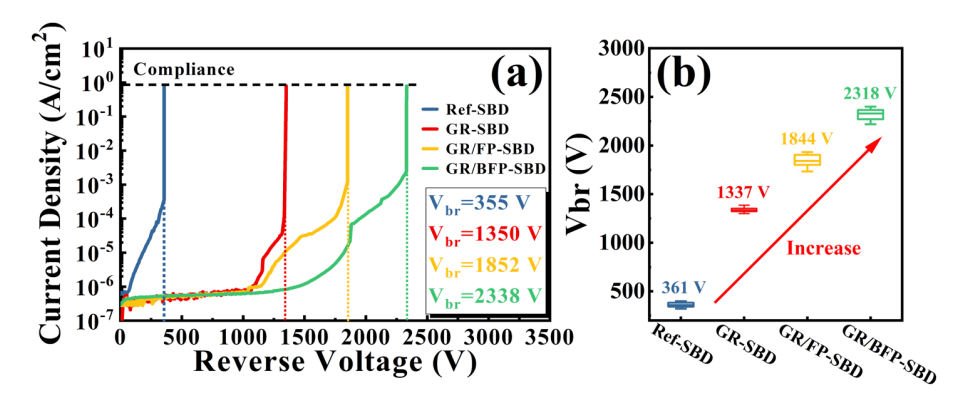 FIG. 8. (a) Reverse breakdown characteristics of four types of devices. (b) Box plot of eight device breakdowns tested for each structure. Box plot shows the average breakdown values of different devices.