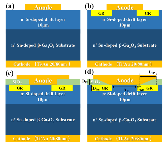 FIG. 1. Schematic cross sections of β-Ga2O3. (a) Ref-SBDs, (b) GR-SBDs, (c) GR/FP-SBDs, and (d) GR/BFP-SBDs.