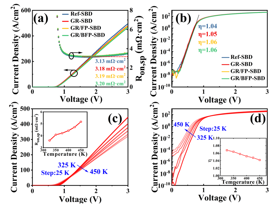 FIG. 7. Forward I–V curves (a) in the linear scale and (b) in the semilogarithmic scale of the four types of devices. (c) Temperature-dependent forward I–V characteristics of the GR/BFP-SBD in the linear scale. The inset shows Ron,sp as a function of temperature. (d) Temperature-dependent forward I–V characteristics of the GR/BFP-SBD in the semilog scale. The inset shows the ideality factor as a function of temperature.
