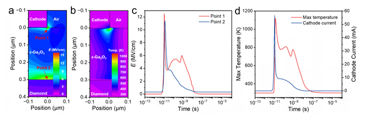 Figure 4. (a) Simulated electric-field and (b) temperature distribution of the diamond/ε-Ga2O3 HJD at the time scale of 10-11 s after a Ta ion striking under an anode voltage of -1200 V. The cathode/ε-Ga2O3 junction spot (Point 1) and the underlying diamond/ε-Ga2O3 spot (Point 2) are identified as two representative critical positions that suffer from electrical field accumulation and transient temperature uprise. (c) The corresponding time-resolved electric-field strength at Points 1 and 2 in (a) throughout a complete ion striking period. (d) The time-resolved maximum temperature and cathode current inside the device throughout the striking period.