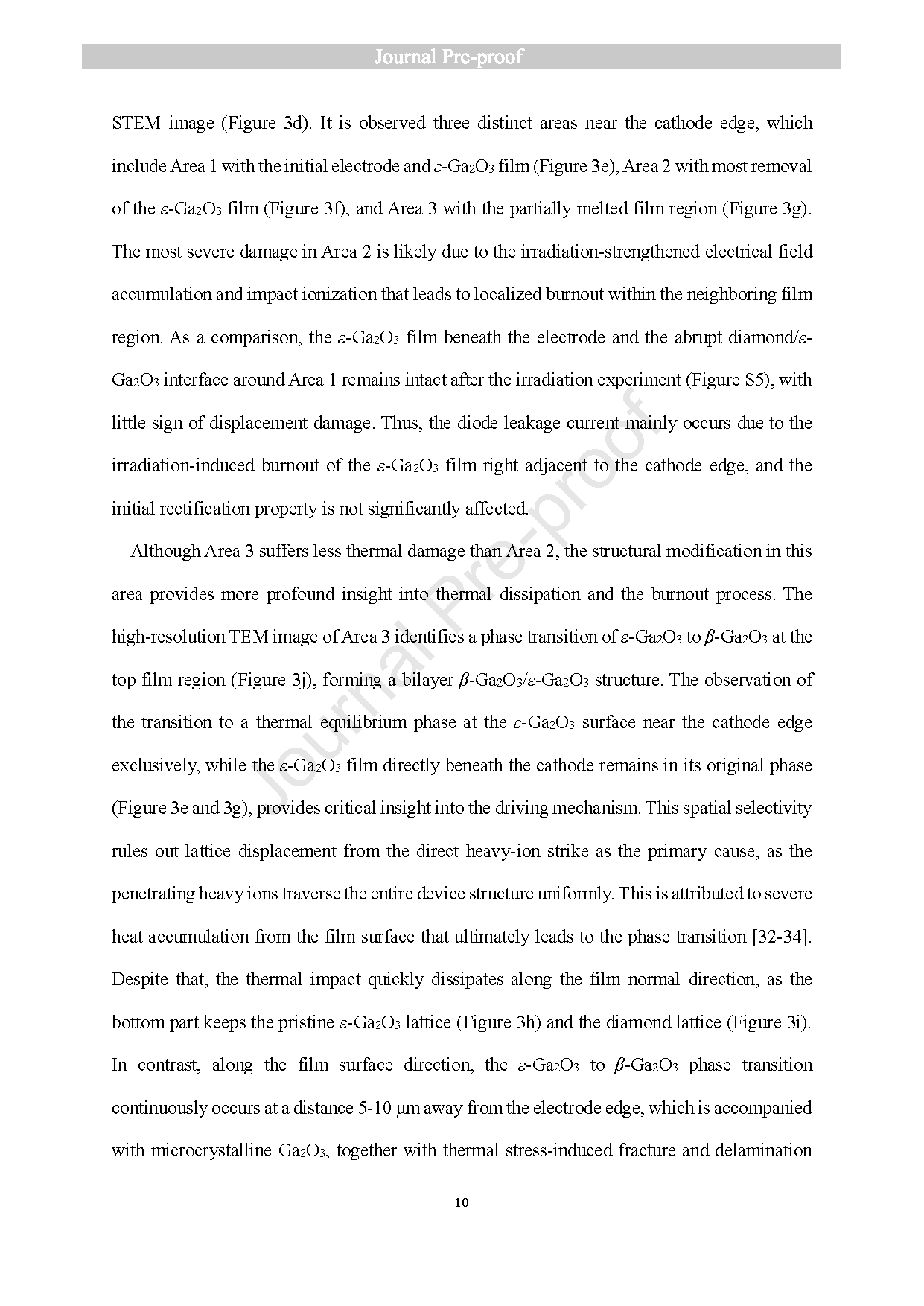 Figure 3. (a) The SEM image of DUT 2 showing representative ion-induced failure regions after the heavy ion irradiation measurement. The false yellow region highlights the Ti/Au electrode coverage over the ε-Ga2O3 film surface. (b) The magnified image of the major failure region 1 from (a). (c) EDS and (d) STEM images of the cross-section along the line shown in (b). (e)-(f) Cross-sectional TEM images of three representative failure characteristics extracted from respectively from Area 1, 2 and 3 in (d). High-resolution TEM images with insets of FFT patterns of (h) diamond, (i) ε-Ga2O3 and (j) phase-transformed region of β-Ga2O3, corresponding to the dashed rectangles in (g).