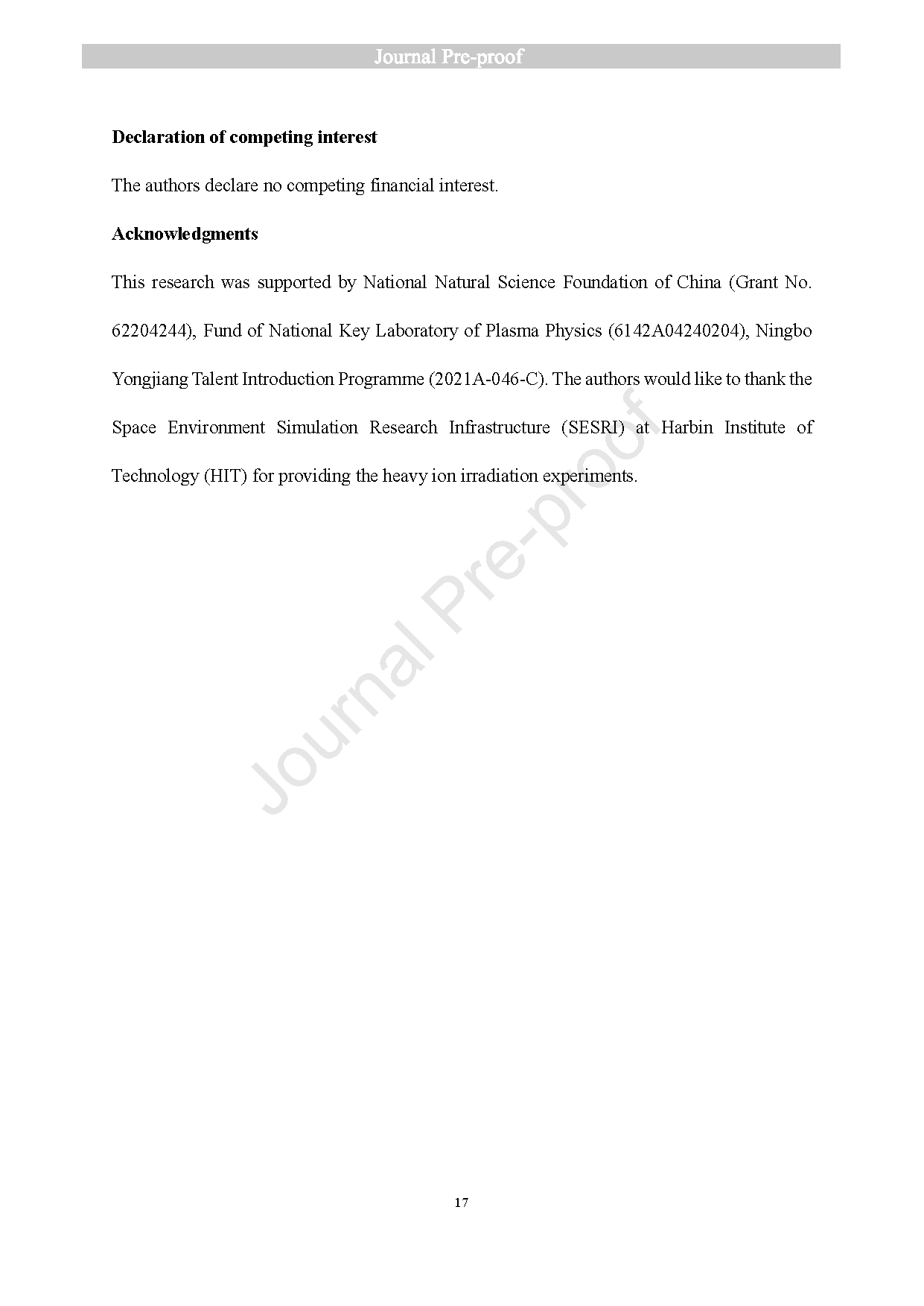 This research was supported by National Natural Science Foundation of China (Grant No. 62204244), Fund of National Key Laboratory of Plasma Physics (6142A04240204), Ningbo Yongjiang Talent Introduction Programme (2021A-046-C). The authors would like to thank the Space Environment Simulation Research Infrastructure (SESRI) at Harbin Institute of Technology (HIT) for providing the heavy ion irradiation experiments.