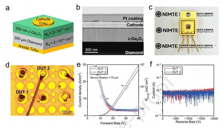 Figure 1. (a) Schematic of the diamond/ε-Ga2O3 HJD structure. (b) The cross-sectional low magnification STEM image of the HJD. Optical micrographs of (c) the packaged diode and (d) bonding spots with electrode radii of 75 μm (randomly selected as DUT 1 and 2). (e) Vertical current density and Ron,sp-voltage characteristics of DUT 1 and 2, respectively, exhibiting uniformity device performance. (f) Reverse current-voltage characteristics of DUT 1 and 2 before irradiation.