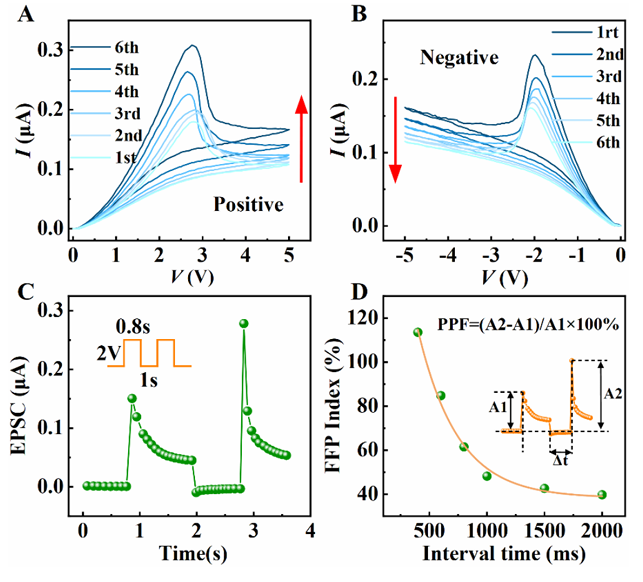 Figure 6. (A) Positive and (B) negative voltages driving analogue RS behaviors of the S3 memristor. (C) EPSC triggered by a pair of consecutive presynaptic spikes. (D) PPF index as a function of the pulse interval.