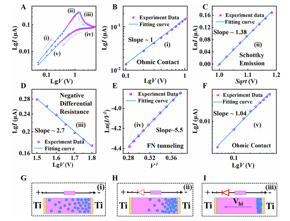 Figure 4.(A) Forward I–V curve of the S3 memristor. (B–F) Fitting results of the I–V characteristics in regions (i–v). (G–I) Schematics of the physical models in regions (i–iii).