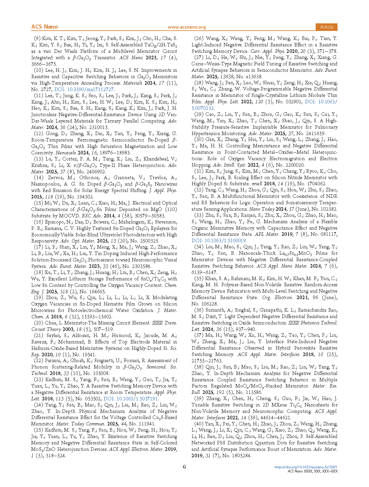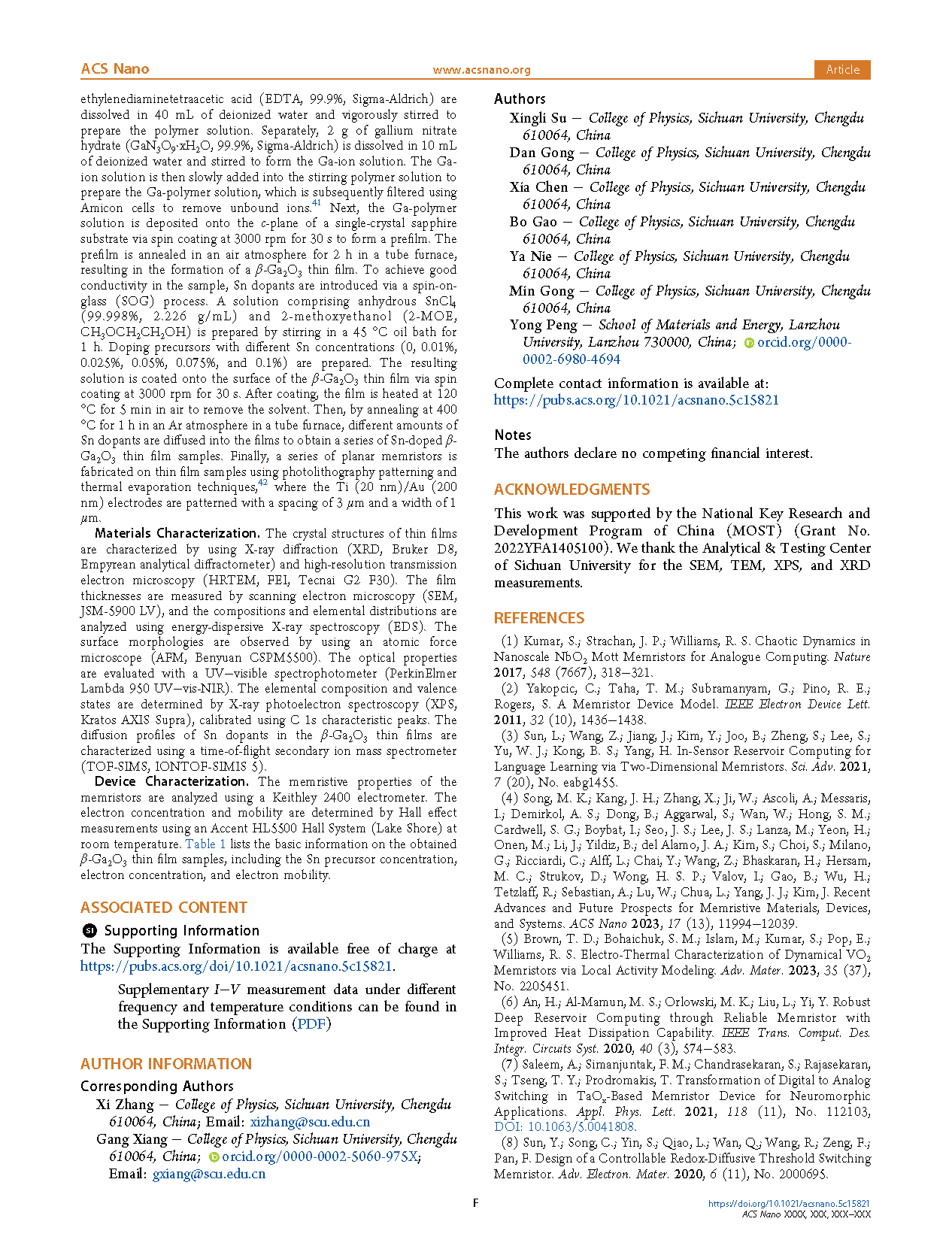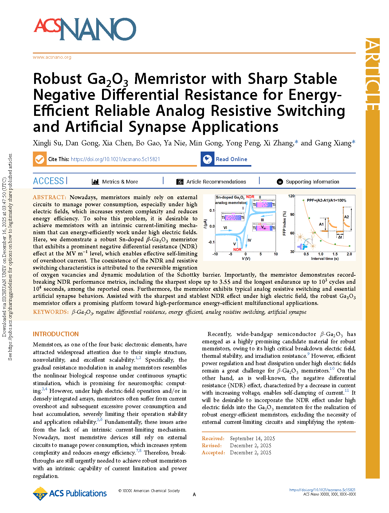 Researchers from Gang Xiang Group at Sichuan University have published a paper titled "Robust Ga2O3 Memristor with Sharp Stable Negative Differential Resistance for Energy-Efficient Reliable Analog Resistive Switching and Artificial Synapse Applications" in ACS Nano (DOI:https://doi.org/10.1021/acsnano.5c15821).