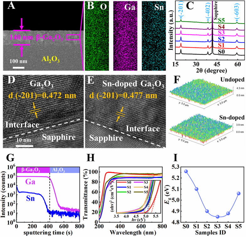 Figure 1.(A) Cross-sectional SEM image and (B) corresponding EDS mapping of S3. (C) XRD patterns of S0–S6. (D, E) Cross-sectional HRTEM images of S0 and S3, respectively.(F) AFM images of S0 (Rq = 0.522 nm) and S3 (Rq = 0.498 nm). (G) SIMS depth profile of Ga and Sn elements in S3. (H) Optical transmittance spectra of S0–S6; the inset shows the (αhν)² versus hν plot. (I) Variation of the bandgap energy (Eg) in S0–S6.