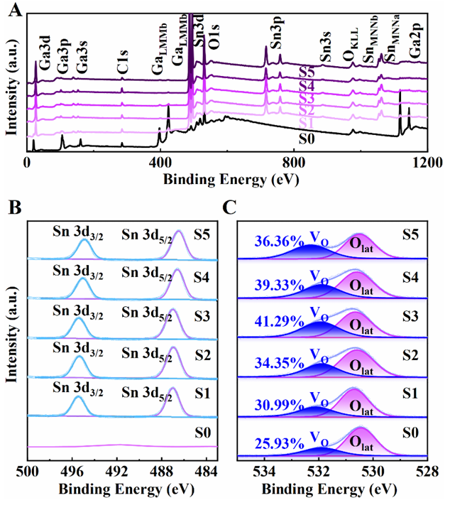 Figure 2. (A) XPS survey spectra, (B) Sn 3d peaks, and (C) O 1s peaks of S0−S5. The integrated area ratios of the VO-related peak are shown in (c).