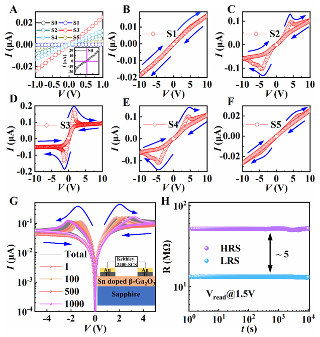 Figure 3. (A) I−V characteristics of undoped (S0) and Sn-doped thin films (S1−S5). (B−F) Memristive characteristics of the memristors based on S1−S5. (g) I−V curves over 1000 continuous cycles under the sweep between −5 V and +5 V, and (h) stability of LRS and HRS under a 1.5 V bias for over 104 seconds in the S3 memristor.