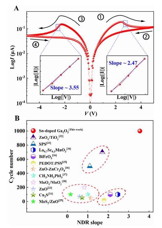 (B) Comparison of the NDR slope and endurance of the Sn-doped β-Ga₂O₃ memristor in this work with those of other reported memristors.