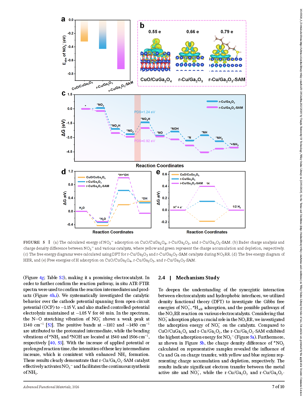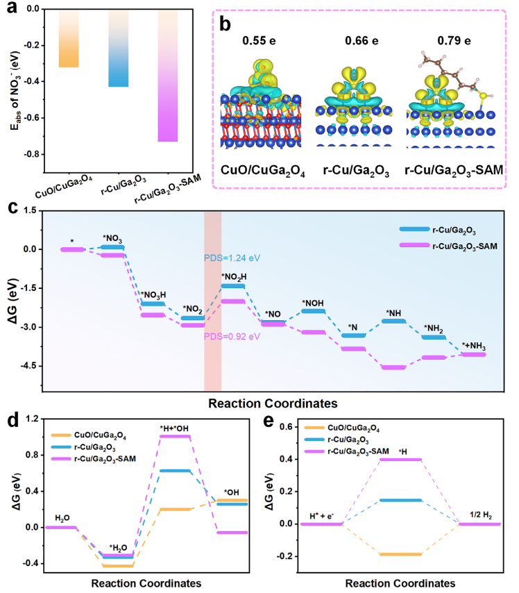 Figure 5. Computational insights into NO₃⁻ adsorption and electrocatalytic activity. (a)Calculated adsorption energies of NO₃⁻ on CuO/CuGa₂O₄, r-Cu/Ga₂O₃, and r-Cu/Ga₂O₃-SAM. (b) Bader charge analysis and charge density differences between NO₃⁻ and various catalysts, where yellow and green indicate charge accumulation and depletion, respectively. (c) Free energy diagrams for NO₃RR on r-Cu/Ga₂O₃ and r-Cu/Ga₂O₃-SAM, calculated using DFT. (d) Free energy diagram for the hydrogen evolution reaction (HER). (e) Free energies of H adsorption on CuO/CuGa₂O₄, r-Cu/Ga₂O₃, and r-Cu/Ga₂O₃-SAM.