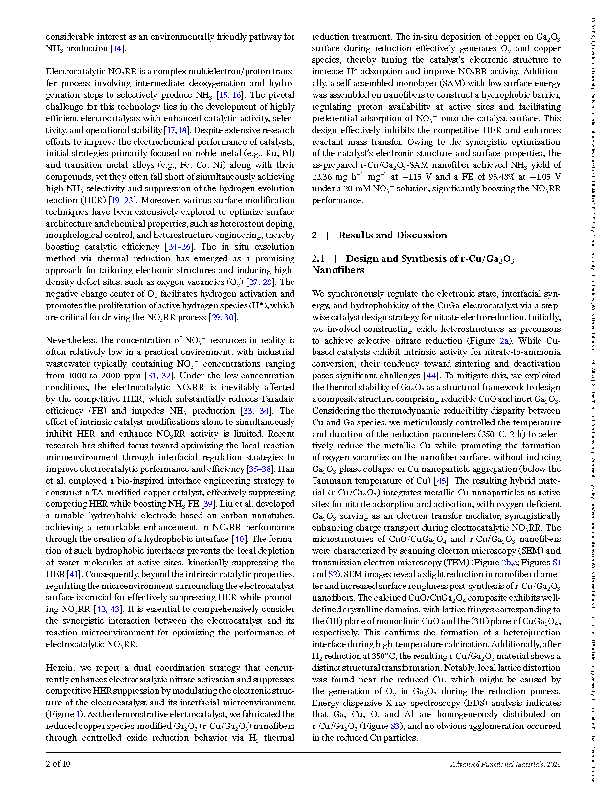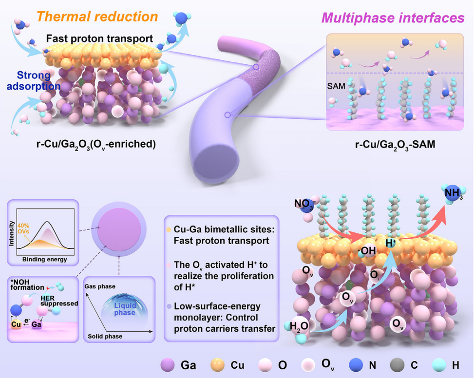 Specifically, a reduced copper species–modified gallium oxide (r-Cu/Ga₂O₃) nanofiber catalyst with abundant Cu species and oxygen vacancies is obtained via thermal reduction of the oxide precursor through an in situ exsolution method, which significantly enhances nitrate adsorption and activation. Moreover, a low-surface-energy monolayer interface is assembled on the nanofiber surface to regulate the reaction microenvironment, restricting proton transfer to active sites and kinetically inhibiting HER.