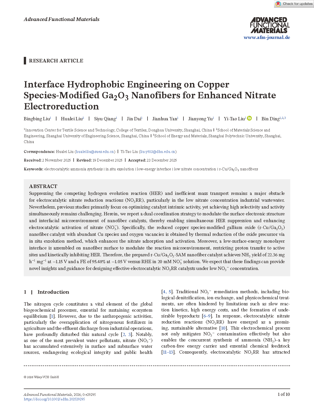 Researchers from the Donghua University have published a dissertation titled "Interface Hydrophobic Engineering on Copper Species-Modified Ga2O3 Nanofibers for Enhanced Nitrate Electroreduction" in Advanced Functional Materials.