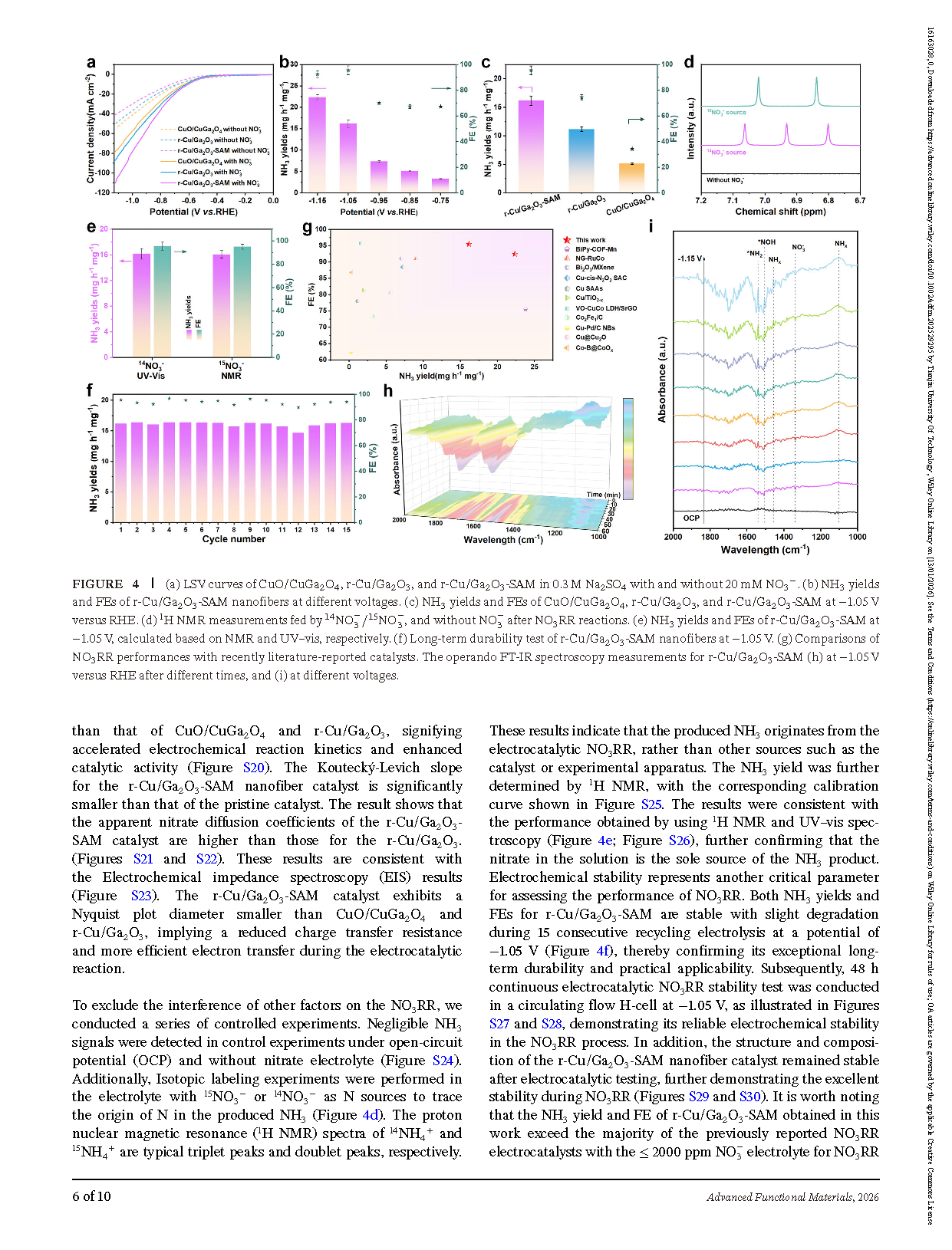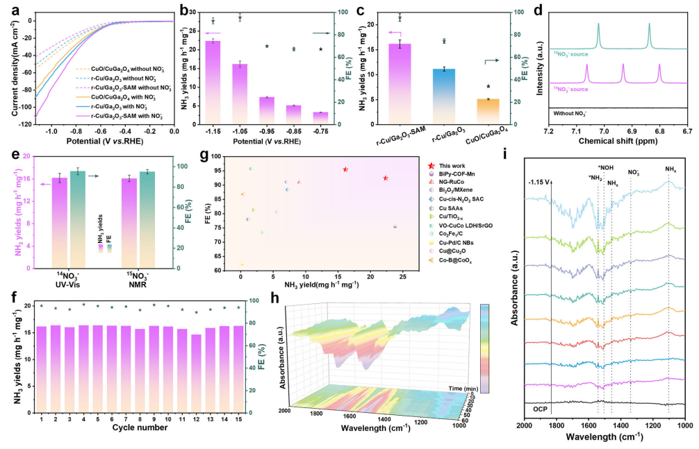(e) NH₃ yields and FEs of r-Cu/Ga₂O₃-SAM at −1.05 V calculated from NMR and UV–vis, respectively. (f) Long-term durability test of r-Cu/Ga₂O₃-SAM nanofibers at −1.05 V. (g) Comparison of NO₃RR performances with recently reported catalysts in the literature. Operando FT-IR spectroscopy measurements of r-Cu/Ga₂O₃-SAM: (h) at −1.05 V versus RHE over different reaction times, and (i) at different applied voltages.
