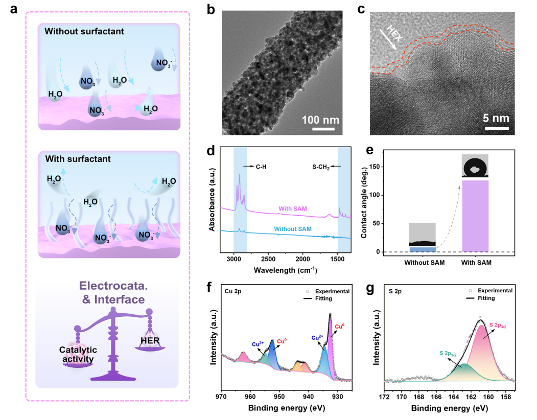 Figure 3. Interfacial microenvironment design of r-Cu/Ga₂O₃-based nanofiber electrocatalysts. (a) Schematic diagram illustrating the hydrophobic interface and microenvironment regulation. (b) TEM and (c) HRTEM images of r-Cu/Ga₂O₃-SAM nanofibers. Comparison of (d) normalized FTIR spectra and (e) contact angles (CA) between membranes composed of r-Cu/Ga₂O₃ and r-Cu/Ga₂O₃-SAM nanofibers. (f) Cu 2p and (g) S 2p XPS spectra of r-Cu/Ga₂O₃-SAM.