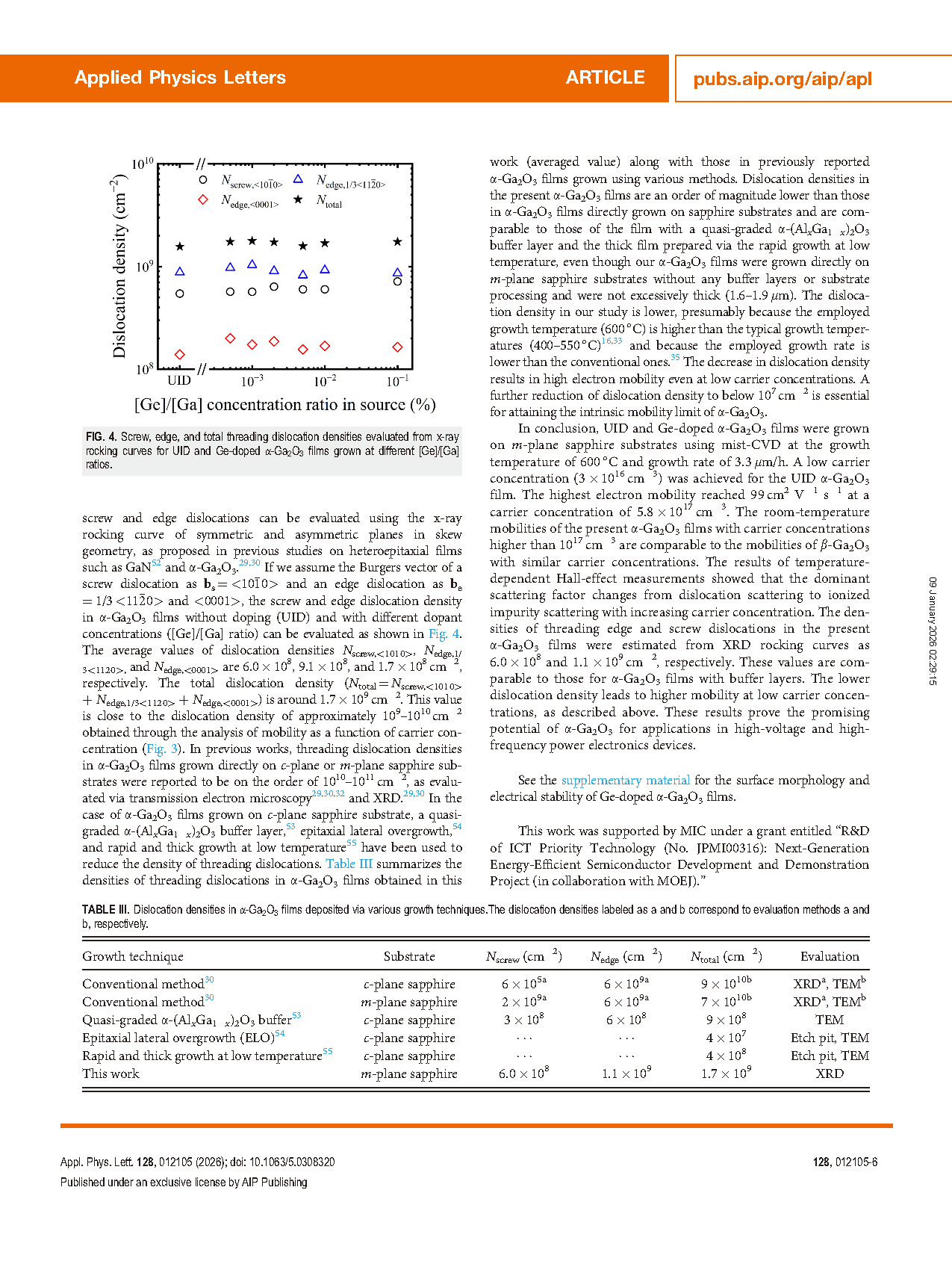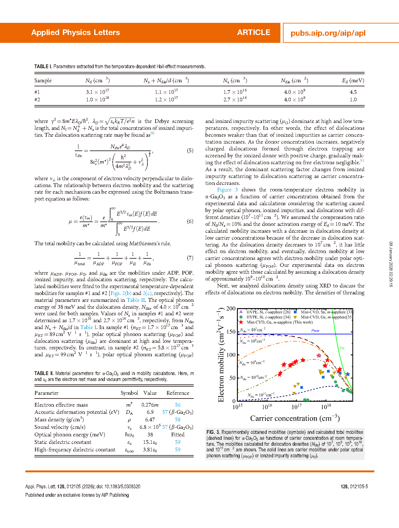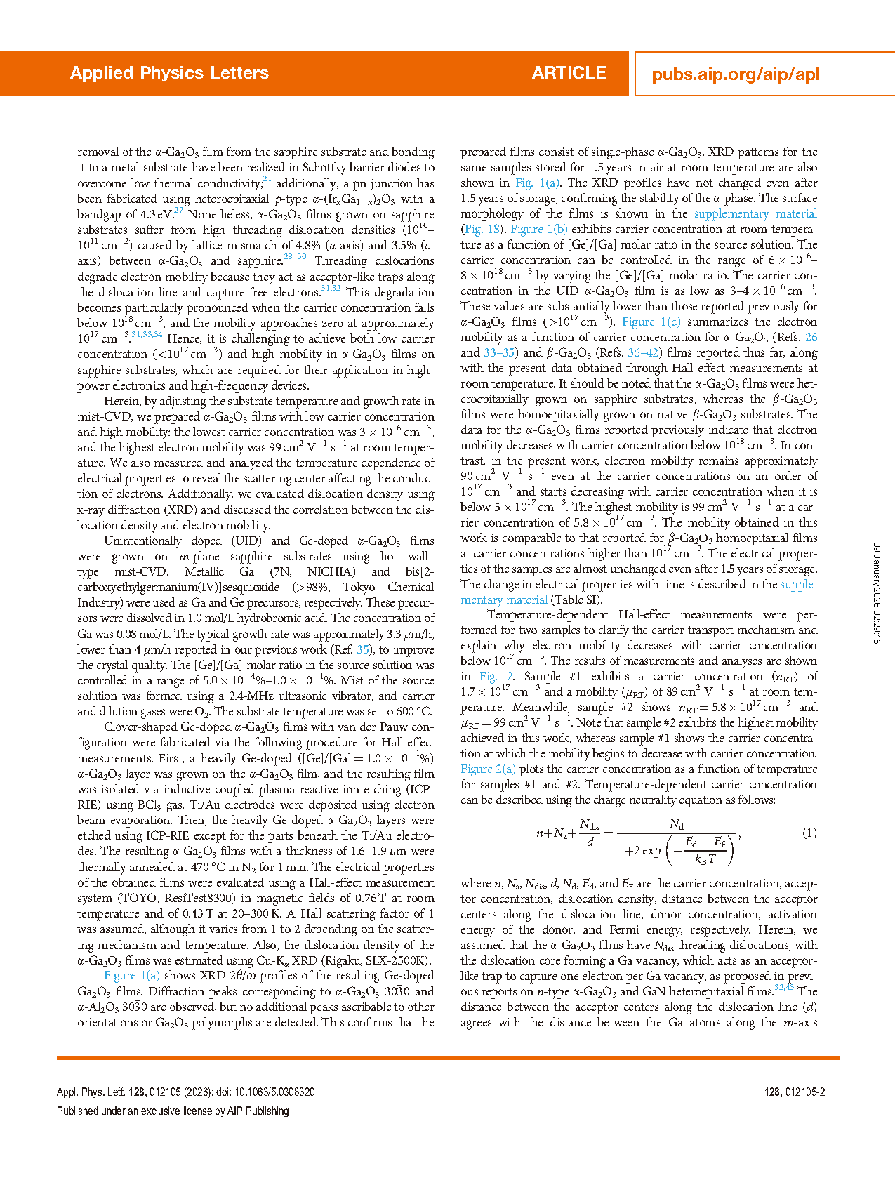 In conclusion, UID and Ge-doped α-Ga2O3 films were grown on m-plane sapphire substrates using mist-CVD at the growth temperature of 600 °C and growth rate of 3.3 lm/h. A low carrier concentration (3 × 1016 cm-3) was achieved for the UID α-Ga2O3 film. The highest electron mobility reached 99 cm2 V-1 s-1 at a carrier concentration of 5.8 × 1017 cm-3. The room-temperature mobilities of the present α-Ga2O3 films with carrier concentrations higher than 1017 cm-3 are comparable to the mobilities of β-Ga2O3 with similar carrier concentrations. The results of temperature-dependent Hall-effect measurements showed that the dominant scattering factor changes from dislocation scattering to ionized impurity scattering with increasing carrier concentration. The densities of threading edge and screw dislocations in the present α-Ga2O3 films were estimated from XRD rocking curves as 6.0 × 108 and 1.1 × 109 cm-2, respectively. These values are comparable to those for α-Ga2O3 films with buffer layers. The lower dislocation density leads to higher mobility at low carrier concentrations, as described above. These results prove the promising potential of α-Ga2O3 for applications in high-voltage and high-frequency power electronics devices.