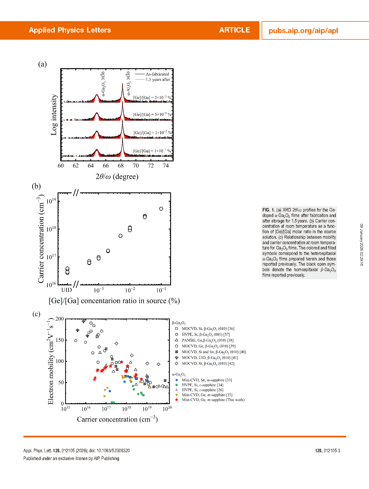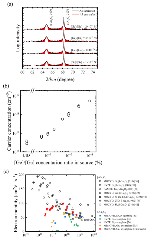 FIG. 1. (a) XRD 2θ/x profiles for the Ge-doped a-Ga2O3 films after fabrication and after storage for 1.5 years. (b) Carrier concentration at room temperature as a function of [Ge]/[Ga] molar ratio in the source solution. (c) Relationship between mobility and carrier concentration at room temperature for Ga2O3 films. The colored and filled symbols correspond to the heteroepitaxial α-Ga2O3 films prepared herein and those reported previously. The black open symbols denote the homoepitaxial β-Ga2O3 films reported previously