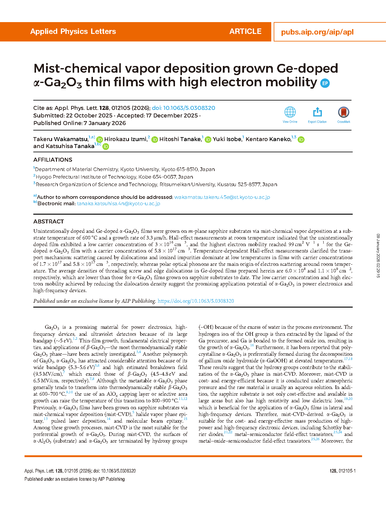 Researchers from the Kyoto University have published a dissertation titled "Mist-chemical vapor deposition grown Ge-doped α-Ga2O3 thin films with high electron mobility" in Applied Physics Letters.