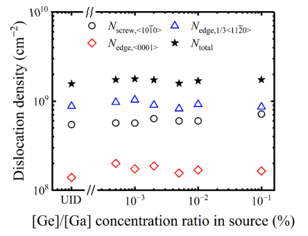 FIG. 4. Screw, edge, and total threading dislocation densities evaluated from x-ray rocking curves for UID and Ge-doped α-Ga2O3 films grown at different [Ge]/[Ga] ratios.