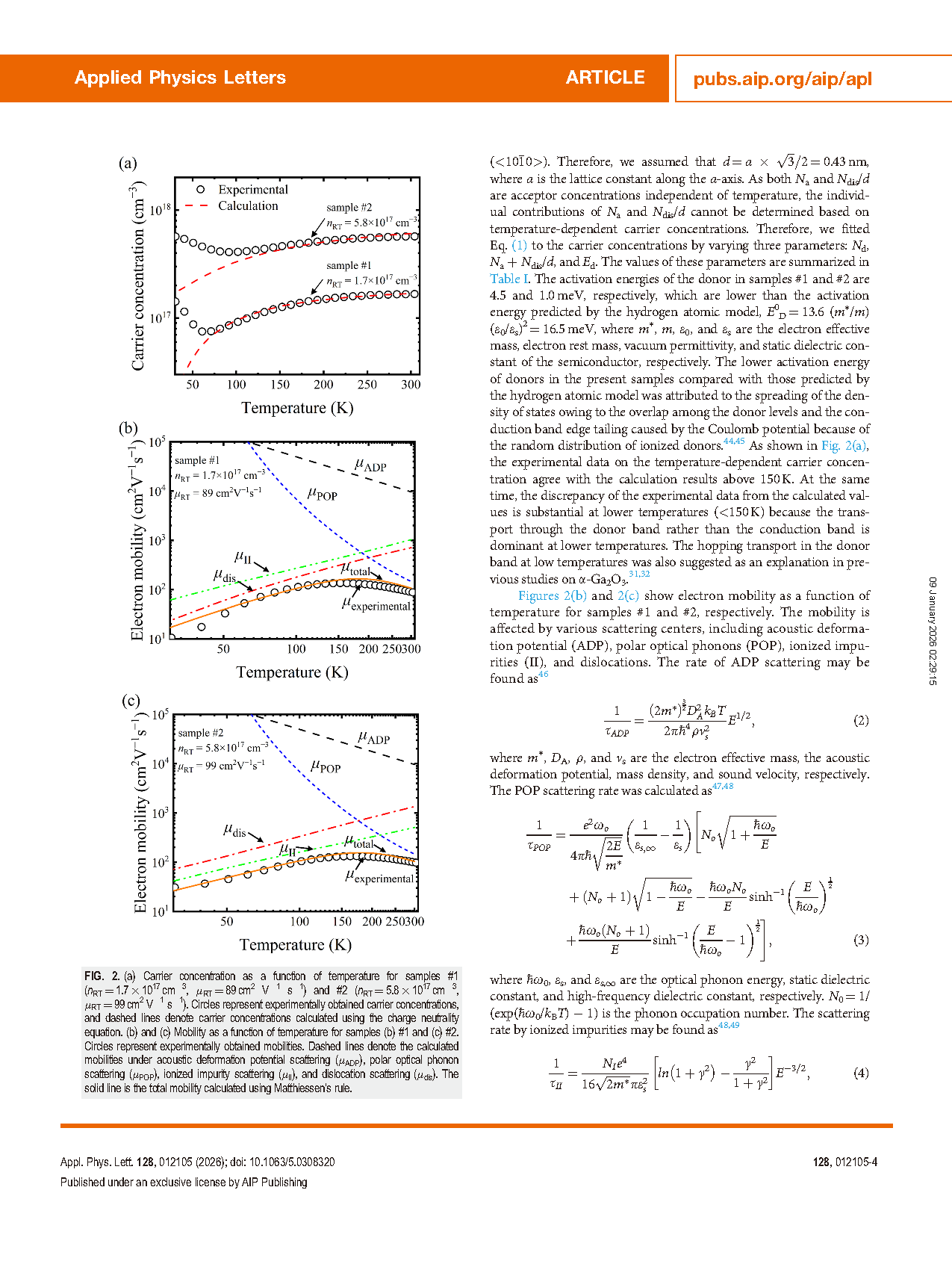 FIG. 2. (a) Carrier concentration as a function of temperature for samples #1 (nRT = 1.7 × 1017 cm-3 , lRT = 89 cm2 V-1 s-1) and #2 (nRT = 5.8 × 1017 cm-3 , lRT = 99 cm2 V-1 s-1). Circles represent experimentally obtained carrier concentrations, and dashed lines denote carrier concentrations calculated using the charge neutrality equation. (b) and (c) Mobility as a function of temperature for samples (b) #1 and (c) #2. Circles represent experimentally obtained mobilities. Dashed lines denote the calculated mobilities under acoustic deformation potential scattering (μADP), polar optical phonon scattering (μPOP), ionized impurity scattering (μII), and dislocation scattering (μdis). The solid line is the total mobility calculated using Matthiessen’s rule.