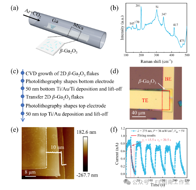 Figure 1. Fabrication, characterization, and electrical performance of β-Ga₂O₃ MIM capacitors.(a) Schematic illustration of the synthesis of β-Ga₂O₃ nanosheets grown on a mica substrate.(b) Raman spectrum of β-Ga₂O₃ nanosheets transferred onto a Si/SiO₂ substrate.(c) Schematic of the key fabrication steps for MIM capacitors using β-Ga₂O₃ as the dielectric layer.(d) Top-view optical microscopy image of a completed capacitor device.(e) AFM image showing the surface morphology.(f) I–t characteristics of β-Ga₂O₃ capacitors measured under dark and illuminated conditions.