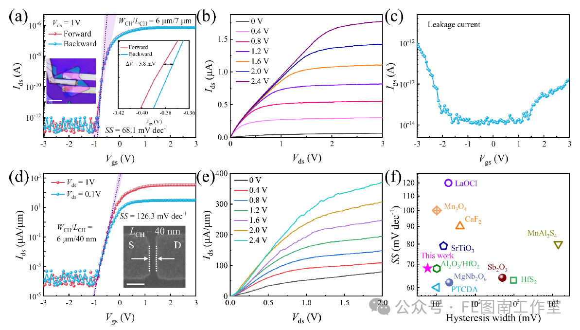 Figure 5. Electrical performance of MoS₂ field-effect transistors employing β-Ga₂O₃ as the top-gate dielectric, fabricated in an oxygen-free glovebox environment.(a) Transfer characteristics (IDS–VGS) measured at VDS = 1 V, showing an on/off ratio > 10⁶, a subthreshold swing of 68.1 mV dec⁻¹, and a hysteresis of 5.8 mV (inset: enlarged view). Inset: optical microscopy image of the device structure. Scale bar: 10 μm. The black solid line denotes the fitting curve, and the purple region represents the 95% confidence interval.(b) Output characteristics (IDS–VDS) measured at stepped VGS values (0–2.4 V), demonstrating current saturation and effective gate modulation.(c) Gate leakage current (IG–VGS) below 10⁻¹³ A, highlighting the excellent insulating quality of the dielectric layer.(d,e) Transfer (d) and output (e) characteristics of a β-Ga₂O₃/MoS₂ FET with a 40 nm channel length. Inset: SEM image of the 40 nm channel in the β-Ga₂O₃/MoS₂ FET. Scale bar: 100 nm.(f) Comparison of subthreshold swing and hysteresis with previously reported dielectric materials (Refs. 48, 51, 54, 55, 57–62), highlighting the superior performance of β-Ga₂O₃.