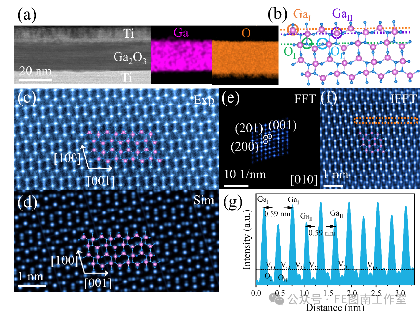 Figure 3. Microstructural and crystallographic characterization of β-Ga₂O₃ capacitors.(a) Low-magnification cross-sectional HAADF-STEM image and corresponding EDS elemental maps of Ga (red) and O (orange).(b) Atomic structure of a two-dimensional β-Ga₂O₃ nanosheet along the [100] crystallographic direction.(c,d) Experimental and simulated HRTEM images of the β-Ga₂O₃ capacitor.(e,f) Fast Fourier transform (FFT) and corresponding inverse FFT images.(g) Intensity line profile along the atomic columns marked by the red dashed box in (f).