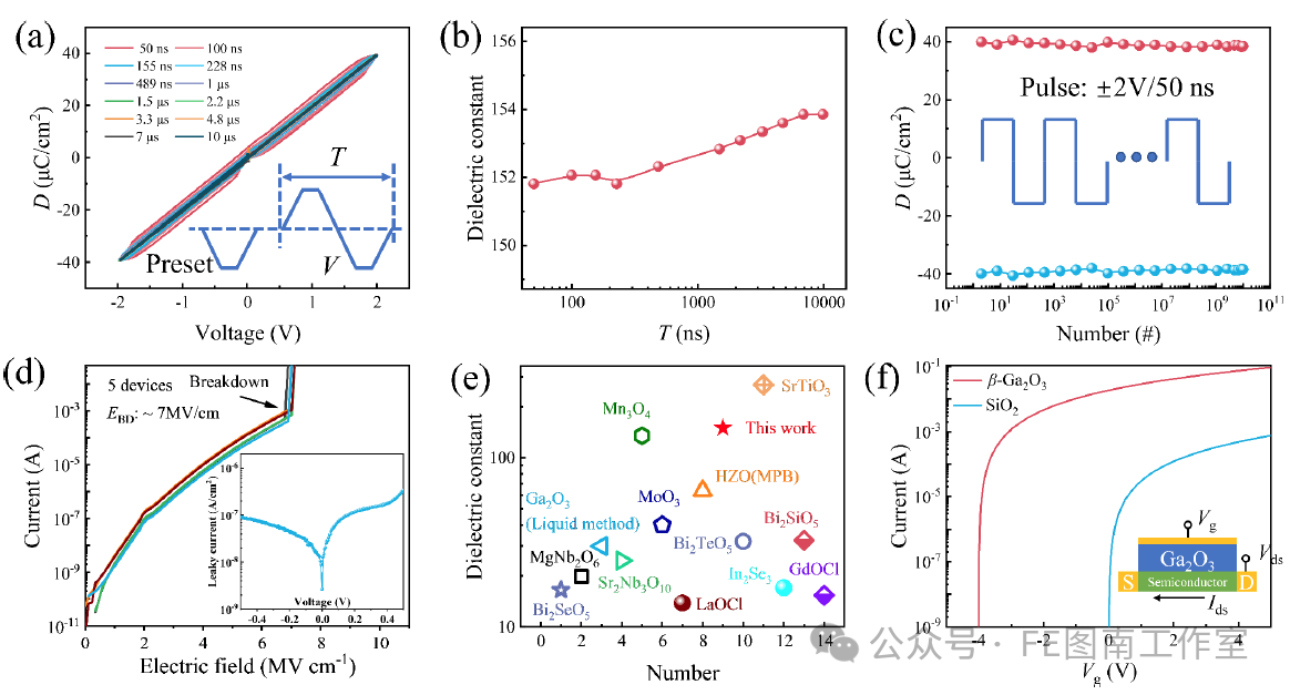 Figure 4. Comprehensive electrical characterization of the high-k performance of β-Ga₂O₃ capacitors.(a) Electric displacement–electric field (D–E) hysteresis loops measured from 20 MHz to 100 kHz; the inset shows the pulse scheme used for D–E measurements.(b) Values of ε′ (in parentheses) estimated from the slopes of the loops in (a).(c) Stored charge density of β-Ga₂O₃ capacitors as a function of cycle number under a unipolar square wave of 2 V / 50 ns at room temperature (repetition frequency: 10 MHz); the inset shows the pulse scheme for endurance testing.(d) Quasi-static I–V characteristics of five independent devices, showing current as a function of applied electric field; arrows indicate breakdown points associated with catastrophic failure. The inset shows leakage current density versus applied voltage (J–V characteristics).(e) Comparison of the dielectric constant achieved in this work with various dielectric materials reported in the literature (Refs. 14, 42, 43, 47–56).(f) Simulated drain current–gate voltage (ID–VG) transfer characteristics of a MOSFET using high-k β-Ga₂O₃ as the top-gate dielectric.