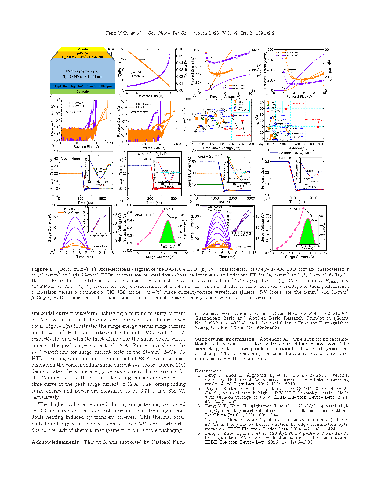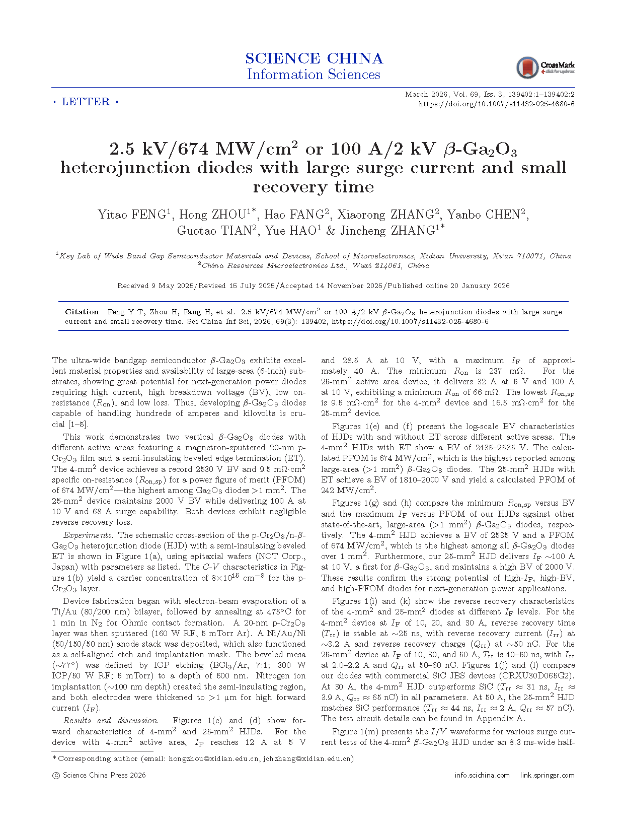 Researchers from the Xidian University have published a dissertation titled "2.5 kV/674 MW/cm2 or 100 A/2 kV β-Ga2O3 heterojunction diodes with large surge current and small recovery time " in Science China-Information Sciences.