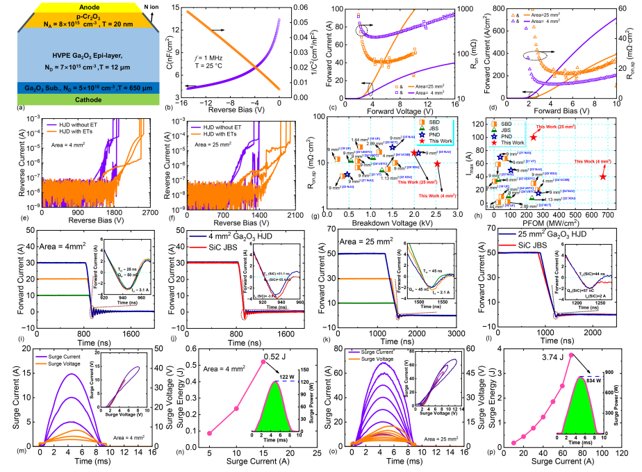 Figure 1 (a) Cross-sectional diagram of the β-Ga2O3 HJD; (b) C-V characteristic of the β-Ga2O3 HJD; forward characteristics of (c) 4-mm2 and (d) 25-mm2 HJDs; comparison of breakdown characteristics with and without ET for (e) 4-mm2 and (f) 25-mm2 β-Ga2O3 HJDs in log scale; key relationships for representative state-of-the-art large area (>1 mm2 ) β-Ga2O3 diodes: (g) BV vs. minimal Ron,sp and (h) PFOM vs. Imax; (i)–(l) reverse recovery characteristics of the 4-mm2 and 25-mm2 diodes at varied forward currents, and their performance comparison versus a commercial SiC JBS diode; (m)–(p) surge current/voltage waveforms (insets: I-V loops) for the 4-mm2 and 25-mm2 β-Ga2O3 HJDs under a half-sine pulse, and their corresponding surge energy and power at various currents.