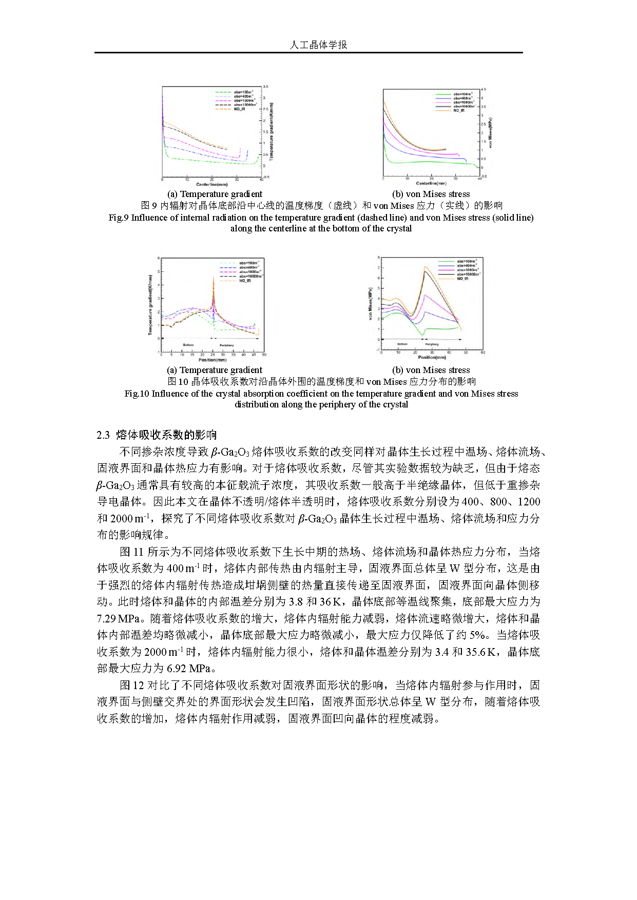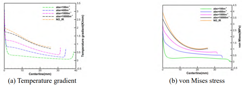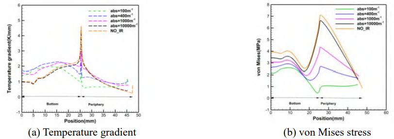 Fig.10 Influence of the crystal absorption coefficient on the temperature gradient and von Mises stress distribution along the periphery of the crystal
