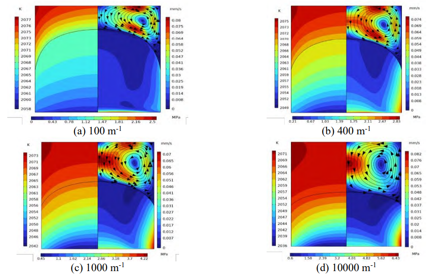 Fig.7 Temperature distribution, velocity field, and Von Mises stress plot under different crystal absorption coefficients