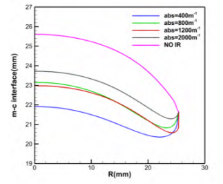 Fig.12 Comparison of melt-crystal interface shapes with different melt absorption coefficients