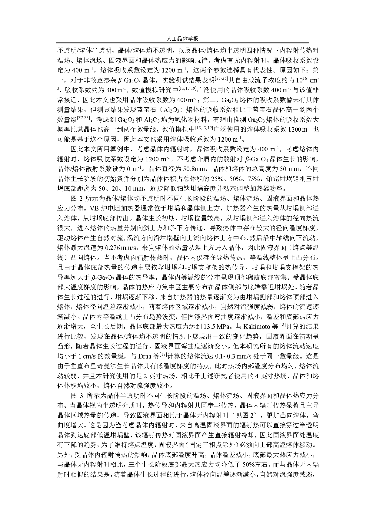 β-phase gallium oxide (β-Ga2O3) crystals have become a key material for high-power devices due to their ultra-wide bandgap characteristics. The vertical Bridgman method is currently the most promising approach for commercial-scale growth of gallium oxide single crystals. However, the semi-transparent nature of gallium oxide crystals and melts can cause significant internal radiation, which affects the temperature and flow fields during crystal growth and thus the crystal quality. Therefore, in this paper, a heat transfer numerical model for the growth process of gallium oxide crystals by the VB method was established using the finite element software Comsol Multiphysics. The influence of internal radiation on the temperature field, melt flow field, melt-crystal interface, and crystal thermal stress was systematically investigated. The numerical simulation results show that the internal radiation in the crystal significantly enhances the thermal transport of the crystal. The radiation heat from the melt-crystal interface can directly penetrate the semi-transparent crystal to the crucible wall, reducing the temperature gradient and thermal stress inside the crystal. This radiation directly cools the melt-crystal interface, causing a downward trend in the temperature at the interface. To maintain the melting point temperature, the melt-crystal interface must move towards the upper high-temperature melt, increasing the convexity of the interface. The internal radiation in the melt also affects the heat transfer in the melt region. The radiation from the hot zone can penetrate the melt to the melt-crystal interface, radiatively heating the interface. Therefore, the melt-crystal interface moves towards the crystal side, and the convexity of the interface shape decreases, presenting a W-shaped distribution. However, since the isothermal lines and thermal stress of the crystal mainly accumulate at the bottom of the crystal, the effect on the temperature gradient and thermal stress inside the crystal is small. In addition, the sensitivity of internal radiation to the absorption coefficients of the crystal and melt was systematically analyzed. It was found that as the absorption coefficient of the crystal decreases, the internal radiation in the crystal increases, the temperature gradients in the melt and crystal decrease, the thermal stress of the crystal decreases, and the convexity of the melt-crystal interface increases, leading to an uneven radial distribution of solutes. As the absorption coefficient of the melt decreases, the internal radiation in the melt increases, the temperature gradient and thermal stress at the bottom of the crystal slightly decrease, the convexity of the melt-crystal interface at the center decreases, the W-shaped distribution becomes more obvious, and the edges are more prone to polycrystalline nucleation, thereby affecting the crystal quality.
